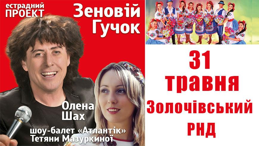 31 травня 2018 року о 19 год. у Золочівському РНД відбудеться концерт Зеновія Гучка, Олени Шах та шоу-балету “Атлантік” Тетяни Мазуркіної. Квитки – у касі Народного дому та у студії Квест(м. Золочів, вул. Рєпіна, 1), тел.: 096 742 49 88. Поділіться цим у соцмережах: