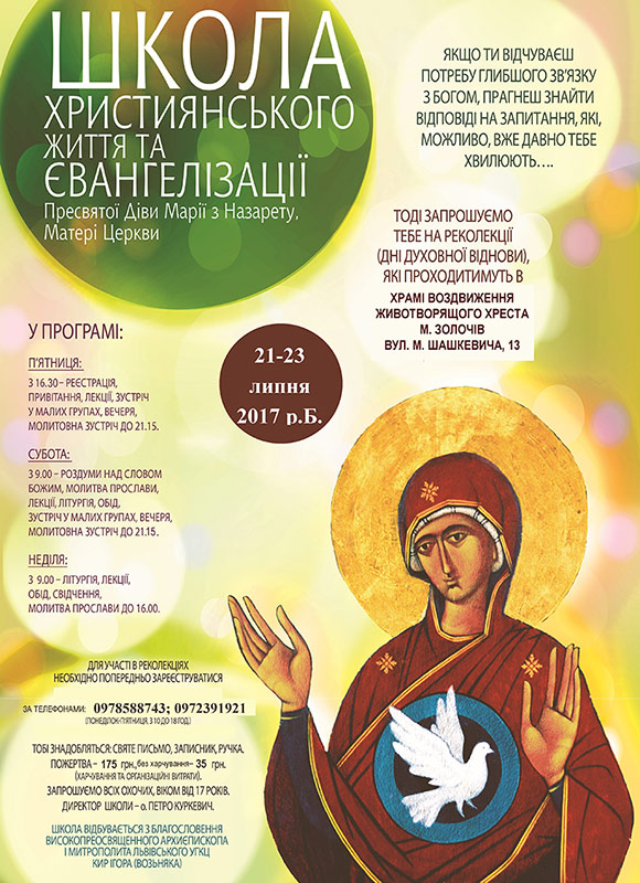 Для участі в реколекціях необхідно попередньо зареєструватися за телефонами:0978588743; 0972391921(понеділок – п’ятниця з 10 до 18 год)