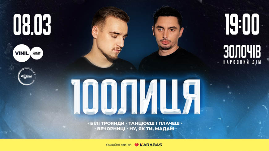 8 березня у Народному домі відбудеться перший великий сольний концерт гурту 100лиця у Золочеві. Початок концерту о 19:00.